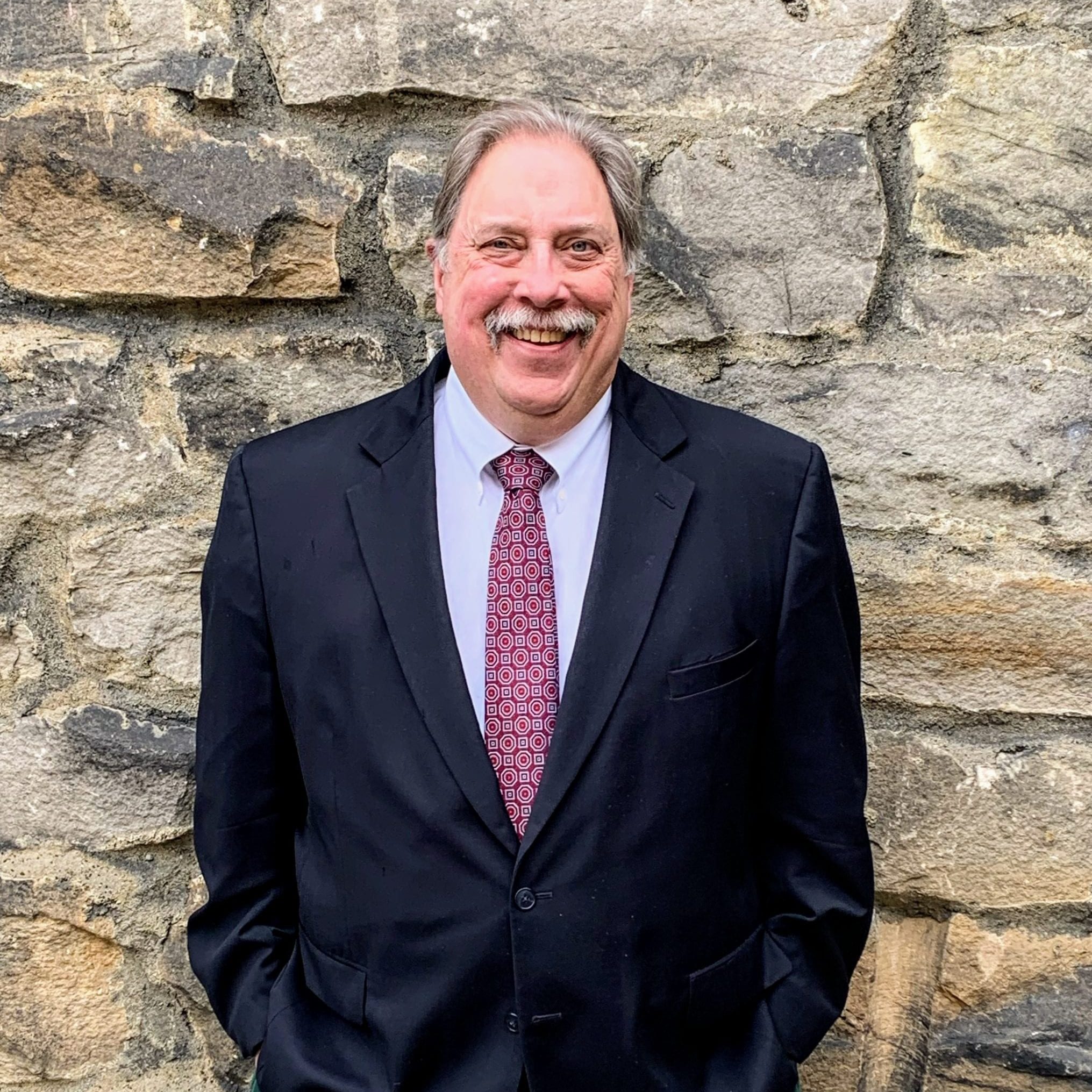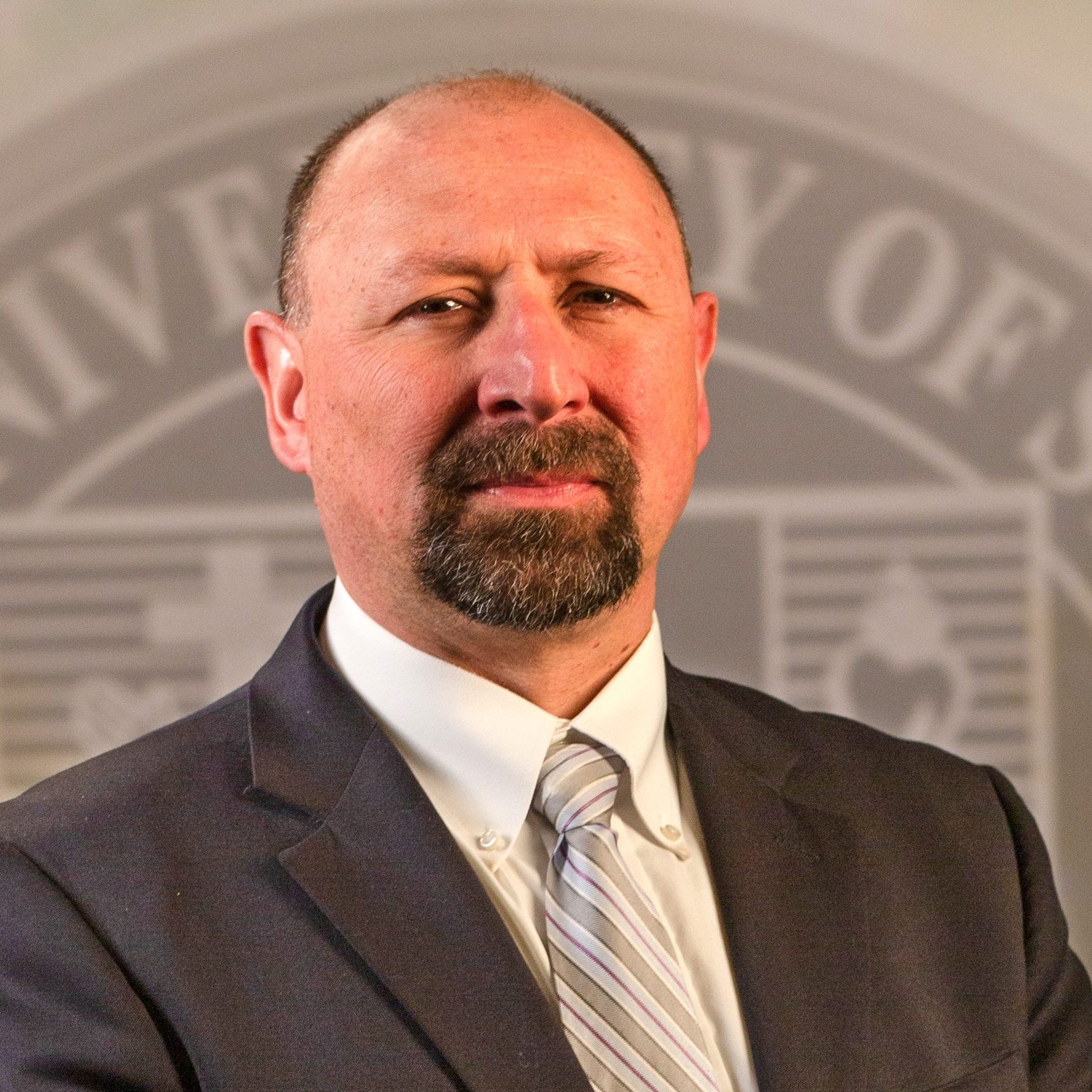 Dr. Ron Bolster standing in front of the Franciscan University of Steubenville seal.